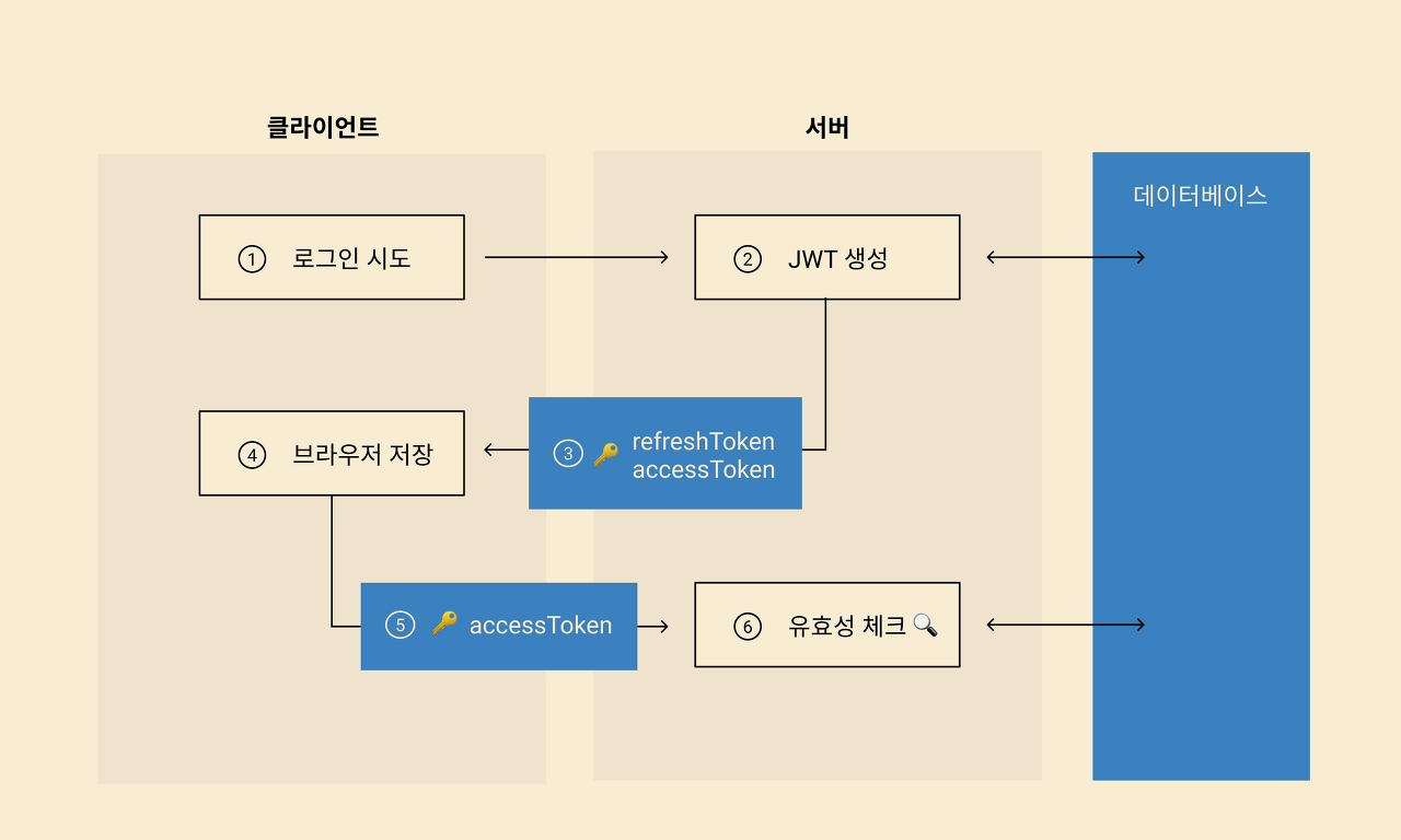 - 추후 서버에 API 요청을 보낼 때 유저 인증이 필요하다면 Access Token이 같이 보내지고, 서버에서 해당 토큰의 유효성이 검증된 뒤 요청이 처리된다. Access Token이 만료가 되었다면 Refresh Token을 이용해 갱신을 해주는 과정을 밟게 된다.