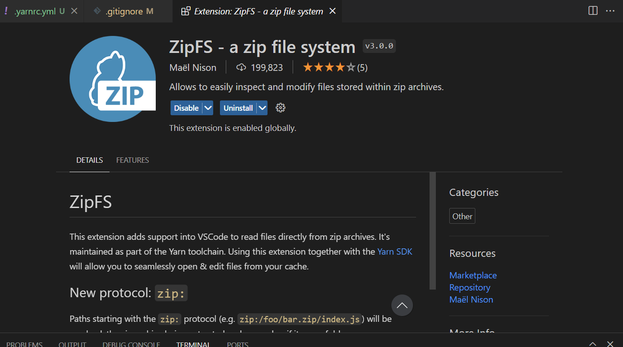 6번까지 해보면 모든 모듈들에 빨간 줄이 쳐지는 당황스러운 순간을 맞이한다. 수많은 빨간줄에 아득해지지만 이는 모듈을 불러오는 데 에러가 발생하는 것이다. pnp 모드의 경우 node_modules와 같이 낱개 파일로 의존성을 관리하지 않고 zip 파일로 관리를 하게 된다. 때문에 zip 파일들을 읽을 수 있도록 ZipFS라는 확장 프로그램을 설치해줘야 한다.