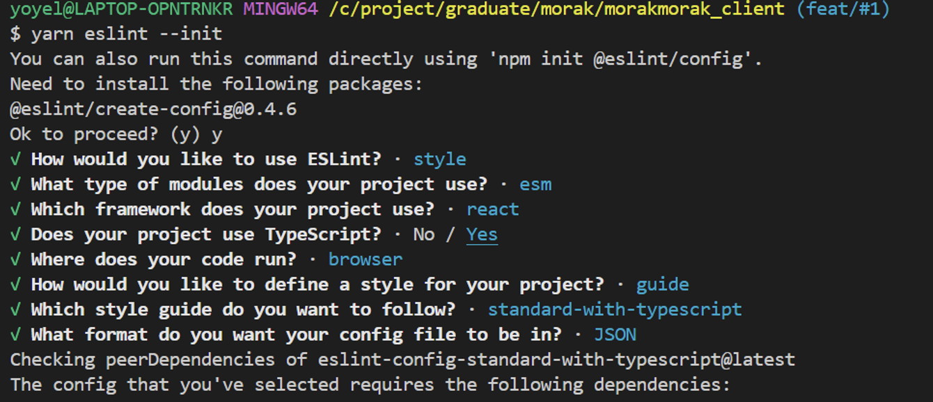 상황에 맞게 대답을 하다 보면 필요한 종속성들도 추가로 설치해주고, .eslintrc.json 파일도 변경이 된다.