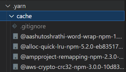 cacheFolder가 현 프로젝트 폴더에 잘 생긴 것을 볼 수 있고, 실제로 필요한 의존성 관련 파일들이 zip 파일로 .yarn/cache 폴더에 들어있는것을 확인할 수 있다.