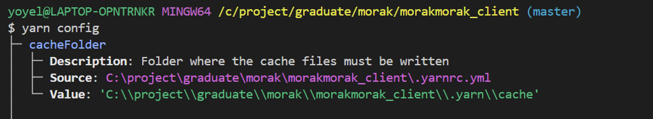 캐시 폴더(cacheFolder)가 설치된 위치를 찾아보기 위해 yarn config 명령어를 입력해보자 아래와 같은 위치에서 cacheFolder를 찾을 수 있었다. 잘 보면 캐시 폴더가 현재 프로젝트 안에 .yarn/cache 이런 식으로 주소가 설정이 되어있는게 아니라 엉뚱한 위치로 설정이 되어있는 것을 볼 수 있다. 이렇게 설정이 된 이유는 찾아 보니 아래와 같았다.